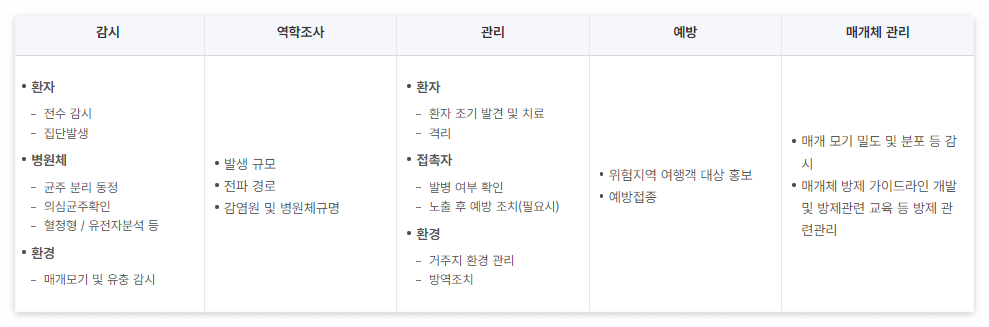 이 검사는 자동화되어 집단 선별 검사운동을 채택하고 백신이 없기 때문에 예방책은 살충제를 사용하면서 서식장소(찻잔 받침, 배수로, 고인물의 열린 저장소, 버려진 타이어 등)의 수를 줄임으로써 매개체를 통제한다.