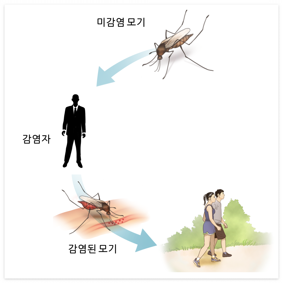 - 지카 바이러스 감염증(Zikavirus Infection) 감염 첫 주 동안 지카바이러스는 혈액 내에 존재한다. 모기가 감염자를 물 때는 바이러스를 포함하는 혈액을 소화하게 되는데, 모기에서 복제되면서 며칠 후 모기가 다른 사람을 물 때 바이러스를 전파할 수 있게 된다.